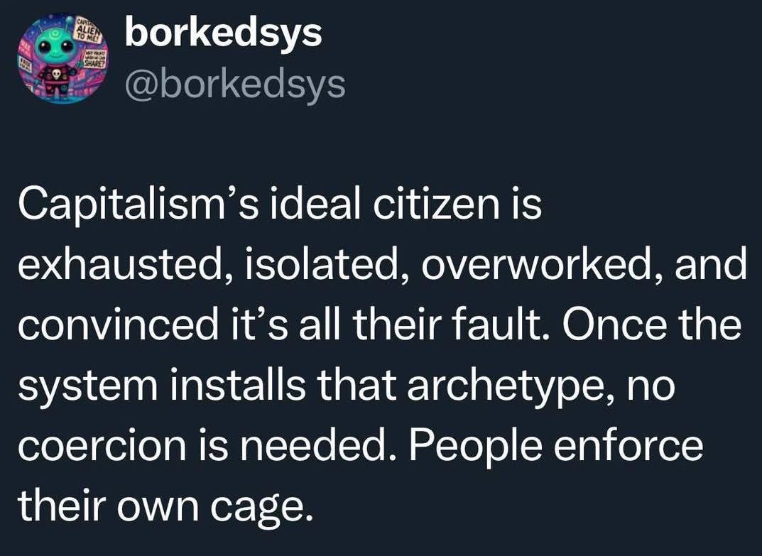 The hard truth is that by continuing to align yourself (mentally, emotionally, financially) with these extractive, exploitive systems, you are contributing to the deterioration of not only your own well-being, but also the well-being of those who are the most vulnerable.